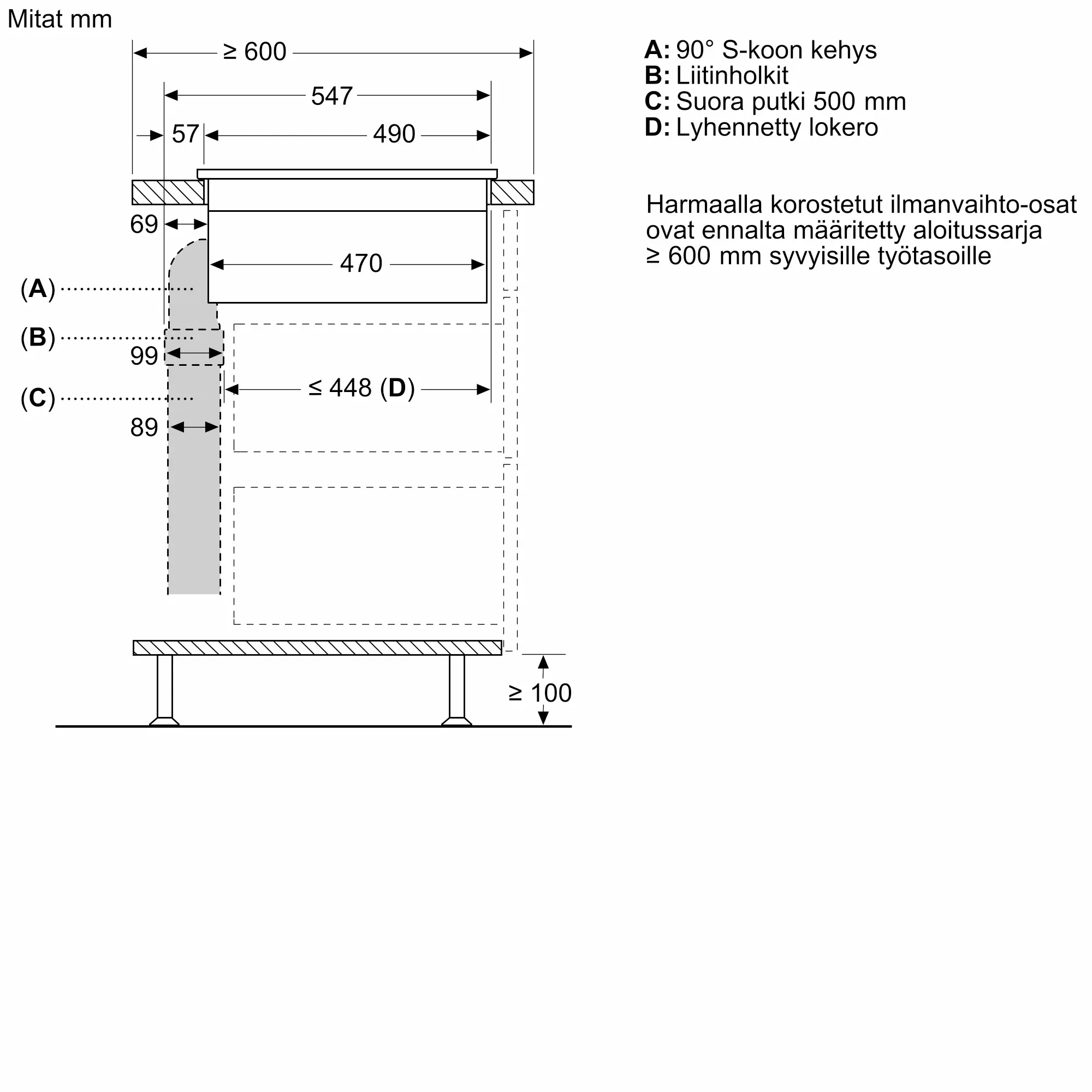 Keittotason, jossa integroitu liesituuletin, asennuspakkaus, kun poistoilma ohjataan hormiin. Työtason syyvyys min. 60 cm.